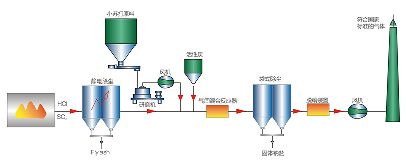 干法脫硫(SDS) 采用成熟的磨粉設備, 將碳酸氫鈉磨成粉粒在800目以上(直徑15um以下) 的細顆粒, 然后由噴射系統將碳酸氫鈉粉噴入SDS反應器中, 與高溫煙氣接觸,NaHCO3快速熱分解,產生大量具有高活性和較大比表面的Na2CO3與SO2發生活化反應。
