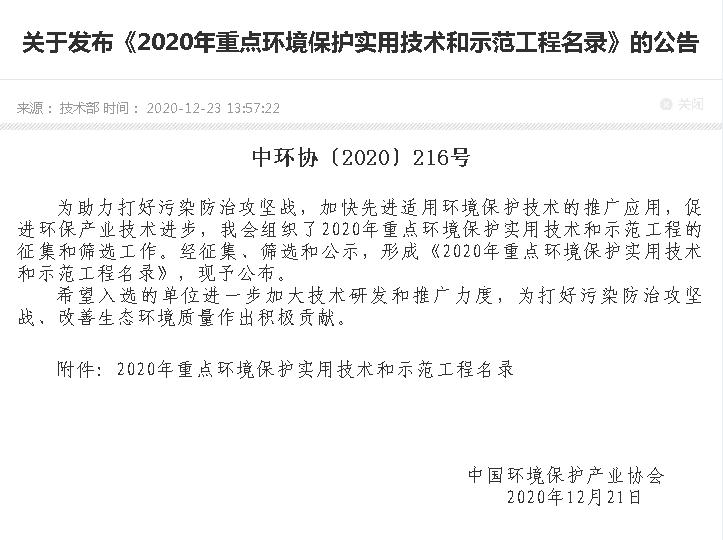 為助力打好污染防治攻堅戰,加快先進適用環境保護技術的推廣應用,促進環保產業技術進步,中國環保產業協會組織了2020年重點環境保護實用技術及示范工程的征集和評價工作。經推薦、形式審查、專家評價及現場考察后,編制形成《2020年重點環境保護實用技術及示范工程名錄》,由浙江天藍環保技術股份有限公司、山西瑞格金屬新材料有限公司申報的“鎂行業鍛白生產線煙氣超低排放工程”項目入選示范工程名錄。