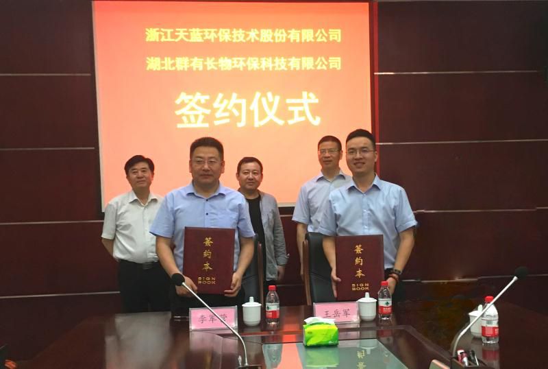 2019年6月20日,浙江天藍環保技術股份有限公司(以下簡稱“天藍環保”或“我司”)和湖北群有長物環保科技有限公司(以下簡稱“湖北群有”)戰略合作簽約暨天藍環保催化劑生產制造基地揭牌儀式在湖北省仙桃市瀏口工業園隆重舉行。湖北群有吳道君董事長、李軍營總經理,我司吳忠標董事長、王岳軍總工程師等領導參加儀式,標志著我司和湖北群有戰略合作翻開嶄新篇章。